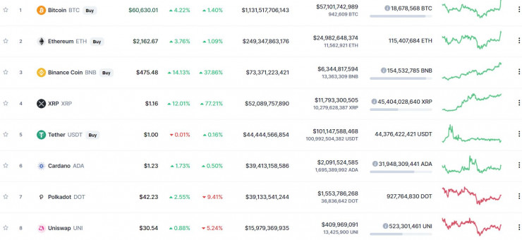 За 24 часа Bitcoin прибавил 4 процента стоимости, рыночная капитализация этой криптовалюты постепенно подбирается к отметке в 1,15 триллиона долларов. Вторая криптовалюта мира, Etherium, тоже растет, и примерно теми же темпами: за сегодня прибавка примерно 3,7 процента и новая цена - около 2160 долларов за 1 ETH. Практически все криптовалюты из топ-10 также демонстрируют рост.