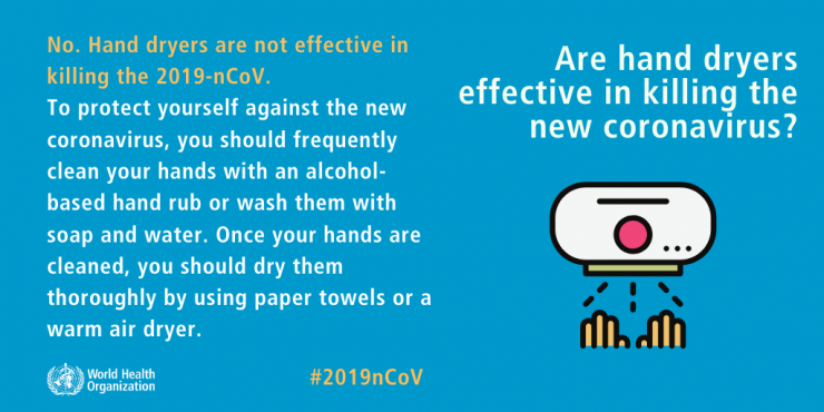 "Чтобы защититься от болезни, вы должны как можно чаще мыть руки с мылом или протирать их спиртовыми салфетками. Теплый поток воздуха же - лишь способ высушить руки, но никак не уничтожить бактерии", - говорится на сайте.