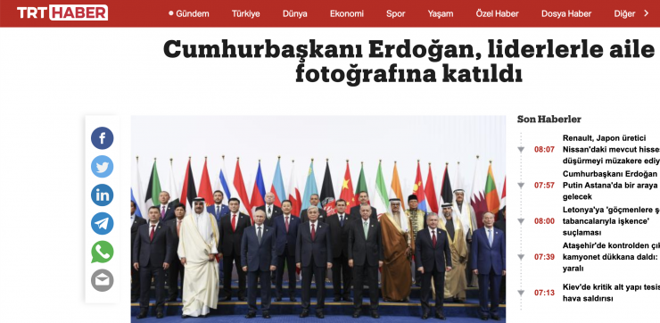 В турецком новостном канале TRT Haber написали об открытии VI саммита Совещания по взаимодействию и мерам доверия в Азии. В портале отметили, что Эрдоган принял участие в совместной фотосессии с лидерами участников саммита, который проходит в Астане.