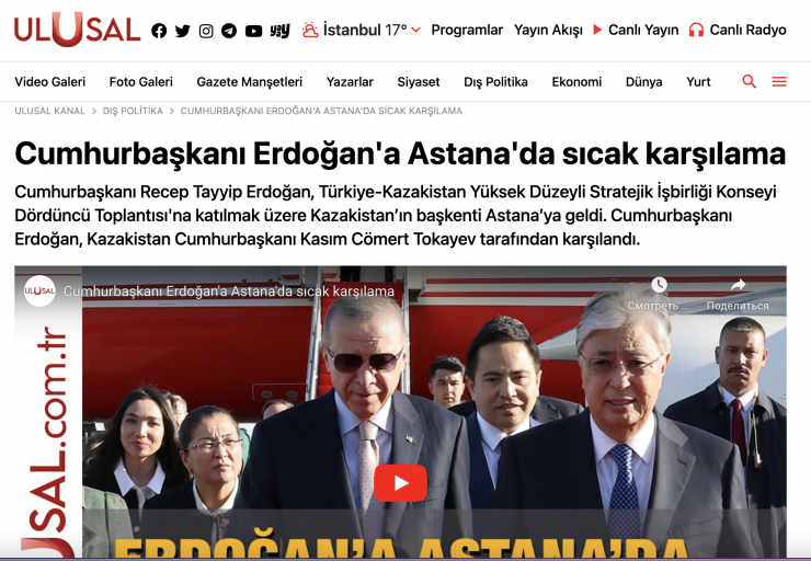 Турецкий телеканал Ulusal Kanal опубликовал статью под заголовком "Теплый прием президента Эрдогана в Астане". Авторы статьи отметили, что Эрдогана приветствовал сам Президент Казахстана Касым-Жомарт Токаев.