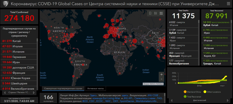 По состоянию на утро 21 марта всего в мире зарегистрировано уже свыше 274 тысяч случаев заражения коронавирусом, почти 88 тысяч человек выздоровели и 11 375 скончались. Об этом сообщают исследователи американского университета Джона Хопкинса.