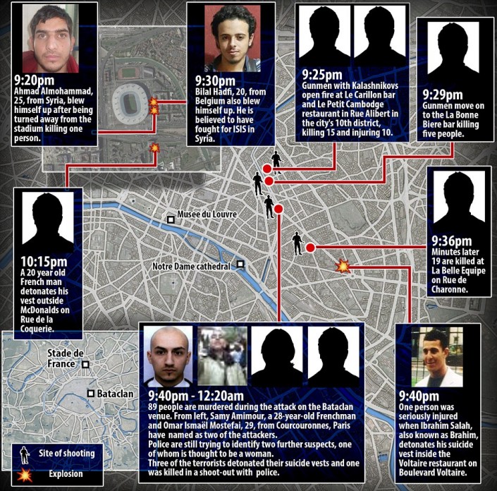 Восемь террористов совершили атаки на Париж вечером в пятницу, 13 ноября. Инфографика: dailymail.co.uk