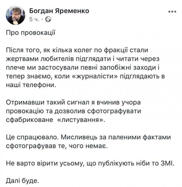 "После того как несколько коллег по фракции стали жертвами любителей подглядывать и читать через плечо, мы применили определенные меры предосторожности и теперь знаем, когда "журналисты" подсматривают в наши телефоны. Получив такой сигнал, я подстроил вчера провокацию и позволил сфотографировать сфабрикованную "переписку", - написал нардеп.