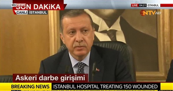 Между тем президент Турции Тайип Эрдоган прилетел в аэропорт Ататюрка в Стамбуле и выступил перед журналистами. Он заявил, что в момент попытки захвата власти находился в отеле в Мармарисе на юго-западе Турции, после его отъезда здание было подвергнуто бомбардировке.