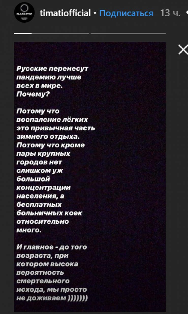 "Русские перенесут пандемию лучше всех в мире. Почему? Потому что воспаление легких - это привычная часть зимнего отдыха. Потому что, кроме пары крупных городов, нет уж слишком большой концентрации населения, а бесплатных больничных коек относительно много. И главное - до того возраста, при котором высока вероятность смертельного исхода, мы просто не доживаем", - написал Тимати во время своего отдыха на Мальдивах.