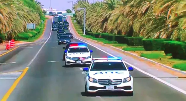 В Абу-Даби кортеж Путина сопровождали конная гвардия, королевская пехота и автомобили Mercedes-Benz с эмиратскими номерами, на капотах которых красовались синие русские буквы "ДПС" и "полиция".