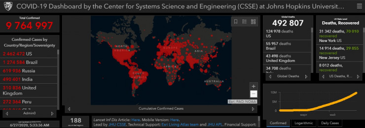 По данным университета, в мире COVID-19 заболели 9 764 997 человек, жертвами инфекции стали 492 807 пациентов, еще 4 917 328 человек выздоровели.
