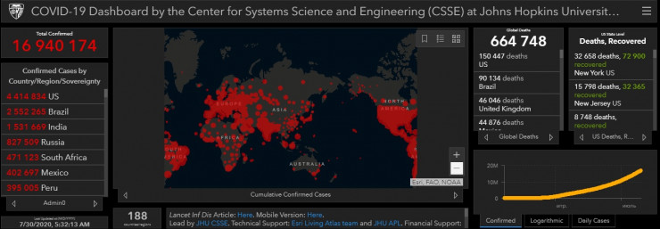 По данным университета, в мире COVID-19 заболели 16 940 174 человека, жертвами инфекции стали 664 748 пациентов, еще 9 897 269 человек выздоровели.