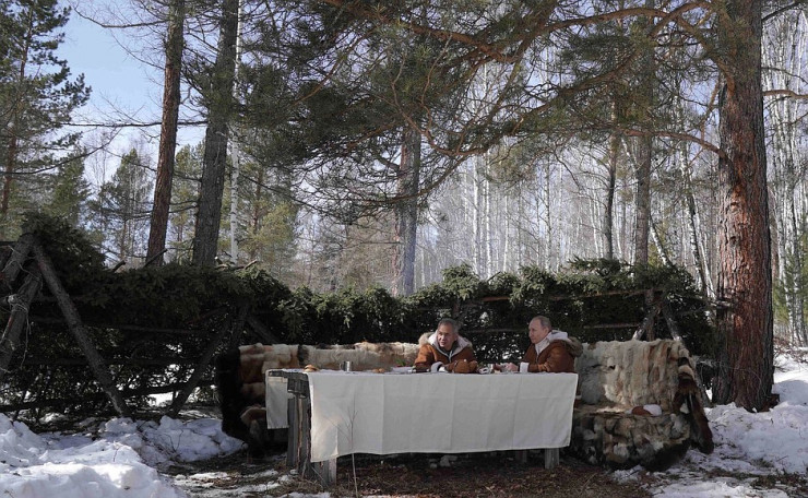Путин сам управлял вездеходом, на пассажирском сиденье сидел Шойгу. Глава государства вместе с министром обороны, гуляя по тайге, прошли по подвесному мосту через реку, понаблюдали в бинокль за местной фауной. После прогулки они пообедали там же в тайге. Расположились они на лавках, на которых были накинуты шкуры. На столе уже была приготовлена колбаса, нарезаны помидоры, огурцы и редис.