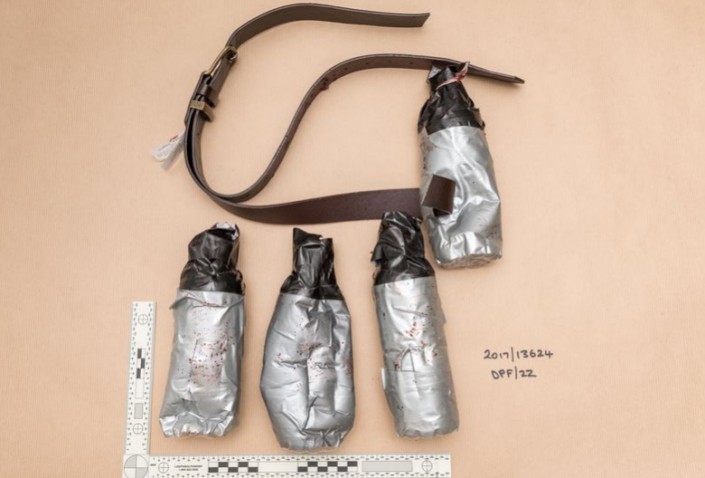 На снимках, которые показала лондонская полиция, видно, что террористы изготовили пояса смертников из кожаных ремней, к которым прикрепили обмотанные изолентой одноразовые бутылки.