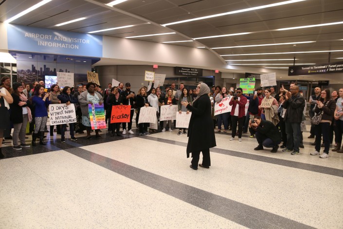 После того как 28 января американские власти начали исполнять распоряжение Трампа, в крупнейших аэропортах США начались акции протеста против указа. С утра субботы в аэропортах Нью-Йорка, Сан-Франциско, Чикаго, Сиэтла и других крупнейших городов проходят митинги в поддержку мигрантов. Люди приезжают к аэропортам, требуя признать действия президента антиконституционными. По всей стране в акциях протеста участвуют тысячи человек, сообщает Meduza.