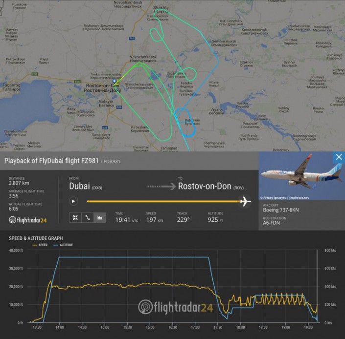По информации Flightradar24 , лайнер начал падать после попытки сесть в аэропорту. "FZ981 набирал высоту после захода на новый круг, после чего неожиданно начал падать с вертикальной скоростью 21000 футов в минуту (106 метров в секунду)", - рассказали во Flightradar24. Портал также сообщил, что перед падением самолет совершил 10 кругов над городом. Вероятно, пилот ожидал улучшения погодных условий.