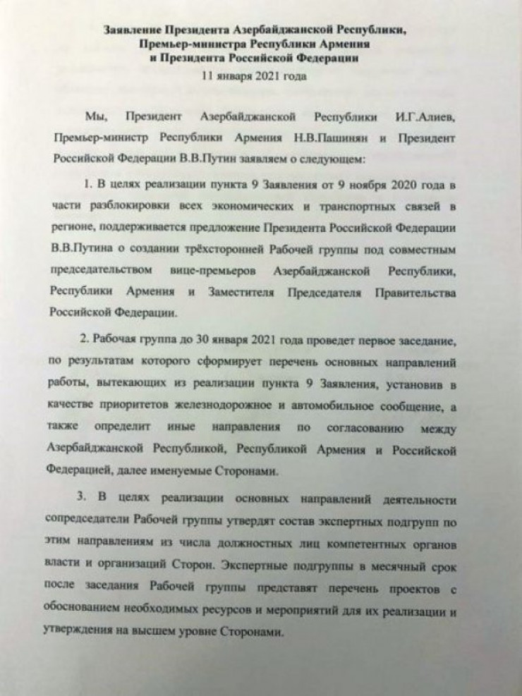 По итогам встречи стороны обнародовали текст совместного заявления России, Армении и Азербайджана. В документе содержится четыре пункта.