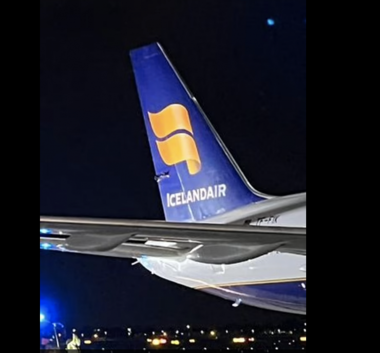 Рейс Korean Air № KE908 должен был вылететь из Лондона в 19:35 в Сеул, Корея. На фотографии видно, что хвост самолета исландской авиакомпании Icelandair получил значительные повреждения от крыла самолета Korean Air.