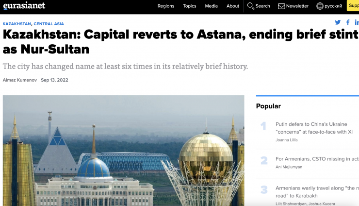 Портал EurasiaNet выпустил статью под заголовком "Казахстан: Столица возвращается к названию Астана после кратковременного пребывания Нур-Султаном". Журналисты сайта подчеркнули, что за свою относительно короткую историю город менял название по меньшей мере шесть раз.
