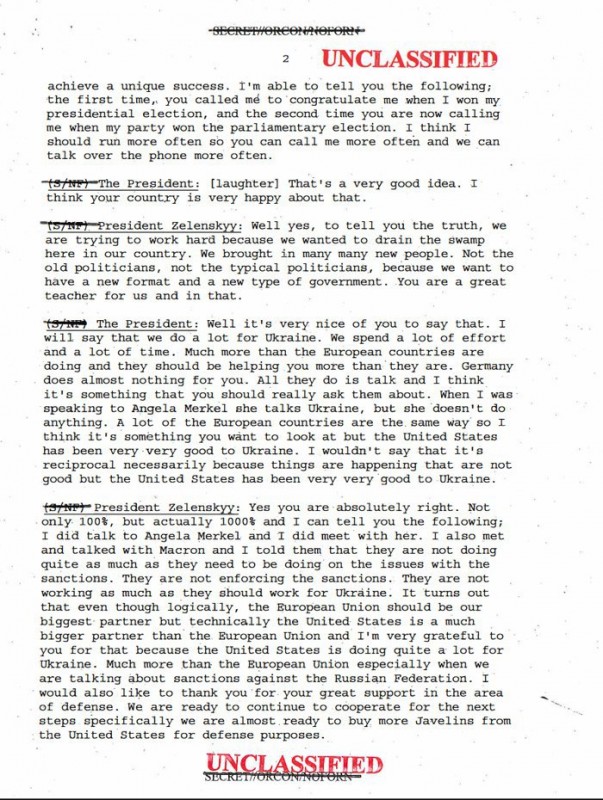 Газета Wall Street Journal со ссылкой на источники сообщила, что Трамп при этом разговоре неоднократно оказывал давление на Зеленского, чтобы тот открыл расследование в отношении сына Байдена Хантера, а также раскрыл некую секретную информацию. Трамп это отрицает и считает, что эта история сфабрикована.