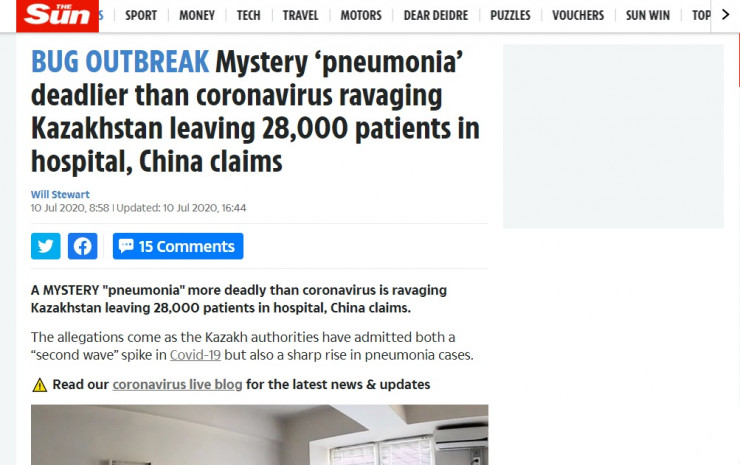 Ұлыбританиялық тағы бір басылым The Sun да Қазақстандағы "белгісіз пневмонияға" назар аударған. Басылым "Коронавирустан да қауіпті "жұмбақ пневмония", Қытай ауруханаларда 28 мыңдай науқас барын айтады" деген тақырыпта ауқымды мақала дайындаған. Материалда денсаулық сақтау вице-министрі Ажар Ғинияттың елде расында коронавирус расталмаған, алайда пневмония диагнозы қойылған 28 мың адам анықталғаны туралы сөзін келтірген.