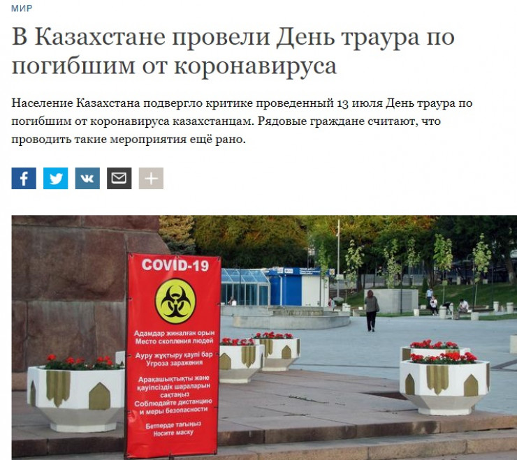 Ресейлік РИА Новости порталы Қазақстандағы коронавирус жағдайы туралы көптеген ақпарат берген. Оның ішінде, Қазақстанда бір тәулікте COVID-19 жұқтырған науқастар саны, пневмония және коронавирустан қайтыс болғандар туралы мәлімет таратқан.