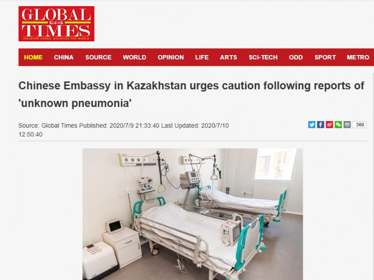 Қазақстандағы Қытай елшілігінің өз азаматтарын елде "белгісіз пневмония" тарағаны туралы ақпарат таратқан газеттің бірі - қытайлық Global Times. Олар "Қытайдың Қазақстандағы елшілігі "белгісіз пневмония" туралы ақпарат шыққаннан кейін сақ болуға шақырды" деген тақырыппен жағдайды баяндаған.