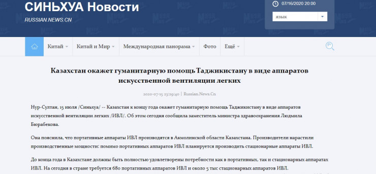 Қытайлық тағы бір басылым - Синьхуа ақпарат агенттігі денсаулық сақтау вице-министрі Людмила Бюрабековаға сілтеме жасап, Қазақстан жыл соңына дейін Тәжікстанға жасанды тыныс алдыру портатив аппараттарын жіберетінін жазған.