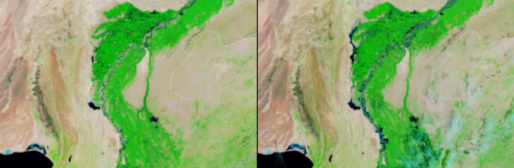 Первыми в серии представлены аэрофотоснимки разницы в муссонных наводнениях в Пакистане и Бангладеш в период с сентября 2019 года по 2020-й. По данным метеорологического управления Пакистана, самый густонаселенный город страны Карачи в прошлом году установил новый однодневный рекорд, когда за 12-часовой период выпало 228 миллиметров дождя.