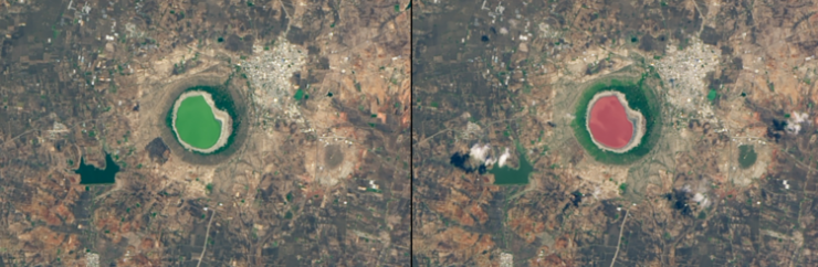 На фотографии озеро Лонар в Индии меняет цвет с зеленого на розовый всего за несколько дней в июне 2020 года. Из-за более теплой погоды большая часть воды в озере испарилась, оставив розовые соли.