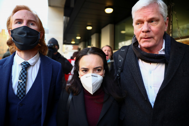 Стелла Моррис, партнер основателя WikiLeaks, главный редактор WikiLeaks Кристинн Храфнссон и представитель WikiLeaks Джозеф Фаррелл после того, как суд отказал в залоге Джулиану Ассанжу. REUTERS/Hannah McKay