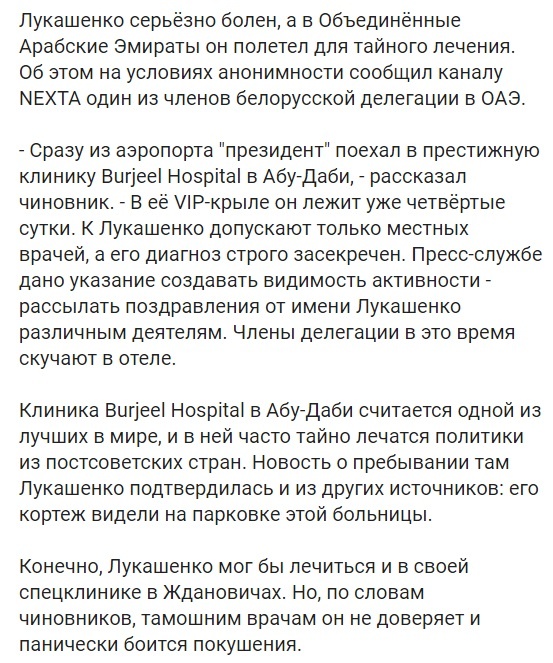 Один из блогеров, ссылаясь на источники в белорусской делегации, сообщил, что сразу из аэропорта Лукашенко поехал в престижную клинику Burjeel Hospital в Абу-Даби и якобы пролежал там несколько дней. Пресс-службе президента при этом дано задание создавать видимость активности, публикуя сообщения и рассылая поздравления.