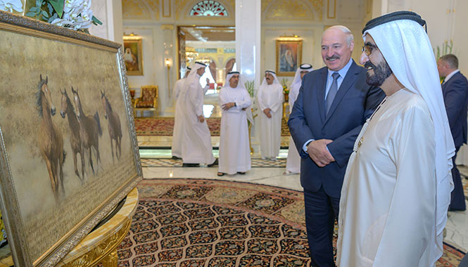 Лукашенко поблагодарил принимающую сторону за гостеприимство и вручил подарок: он привез шейху картину "Лошади" белорусского художника Андрея Ситько, а также корзину с белорусскими сладостями, мясными и молочными продуктами.