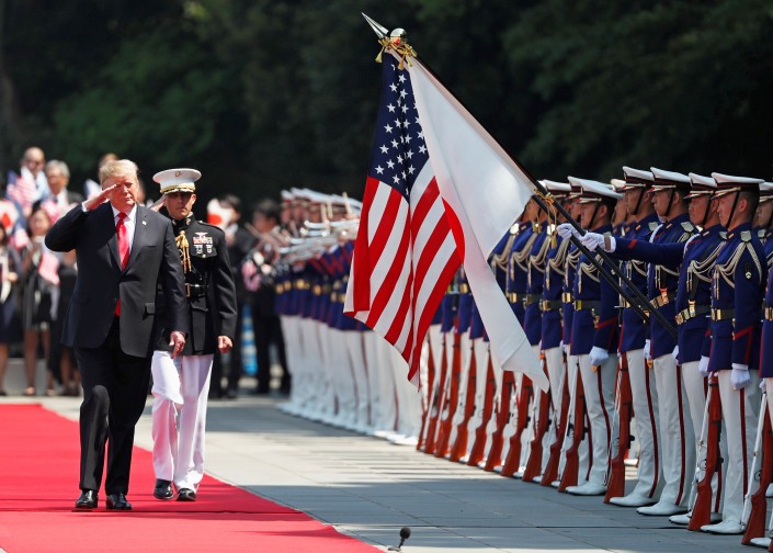 Для приветствия американского президента перед дворцом расстелили красные ковровые дорожки и был выстроен почетный караул. Прозвучали гимны двух стран. Группа школьников приветствовала Трампа американскими и японскими флагами под музыку в исполнении духового оркестра. Затем император Японии и императрица Масако с Трампом и его супругой Меланией приветствовали государственных деятелей Японии перед тем, как удалиться во дворец.
