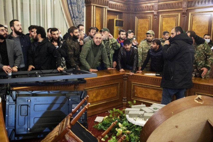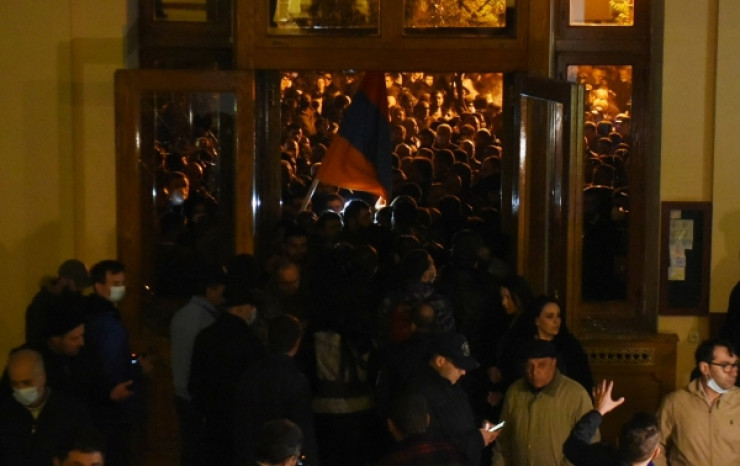 Кейін наразы топ парламент ғимаратына кірді. Күзет оларға тосқауыл қоюға тырысқан, алайда олар күзетшілерді итеріп кіріп, мәжіліс залына жетті. Залдағы мінберге адамдар тұрып, Қарабақтағы әскери әрекеттерді жалғастыруды талап етті.