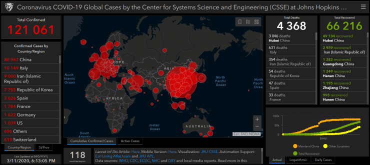 По актуальным данным, в мире заразились более 121 тысячи человек. 4368 человек скончались от болезни. Более 66 тысяч официально выздоровели после заражения.