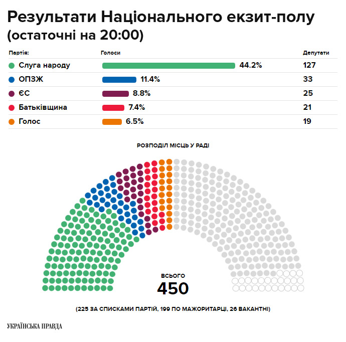 Лидирует партия действующего президента страны Владимира Зеленского "Слуга народа " (44,2 процента голосов), за ней следует "Оппозиционная платформа - За жизнь" (11,4), на третьем месте партия "Европейская солидарность " экс-президента Петра Порошенко (8,8).